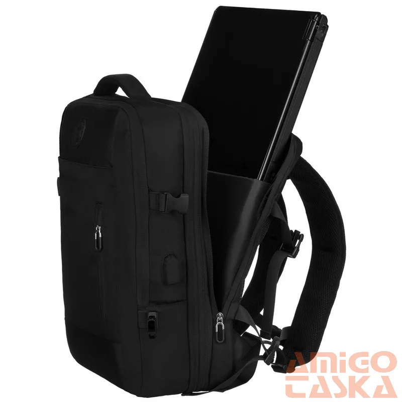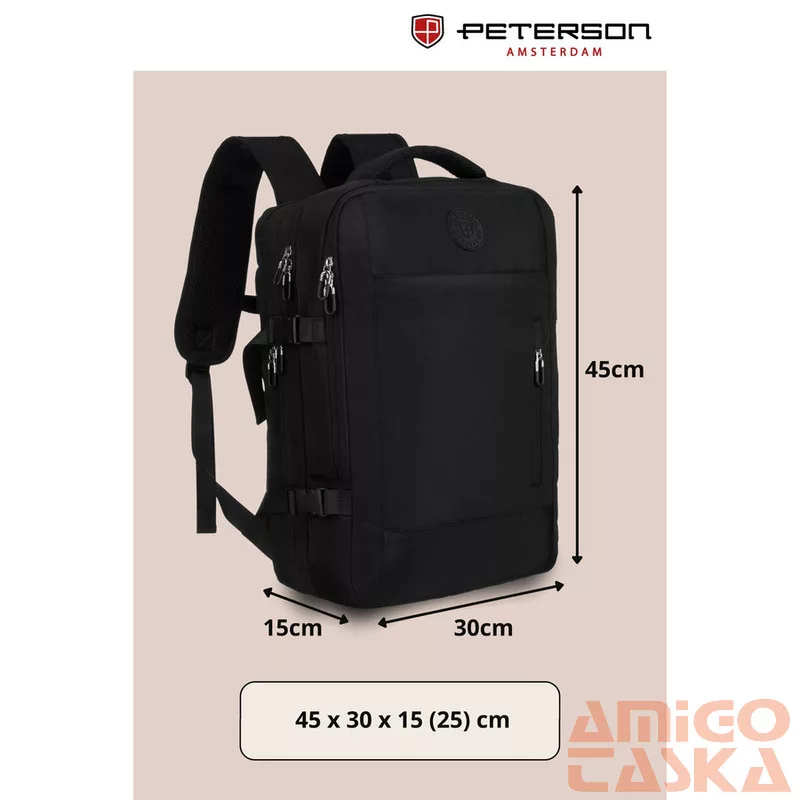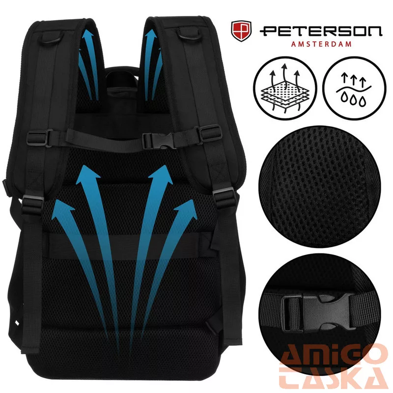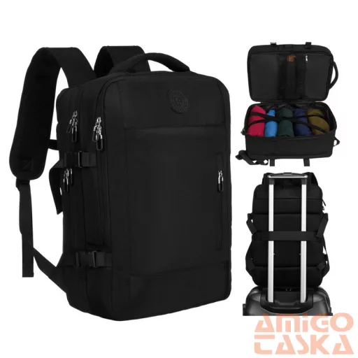 A hátoldalon található széles pánt lehetővé teszi a hátizsák biztonságos rögzítését a kézipoggyász fogantyújához. Ez a megoldás tehermentesíti a vállakat, és megkönnyíti a repülőtereken és vasútállomásokon való tájékozódást.