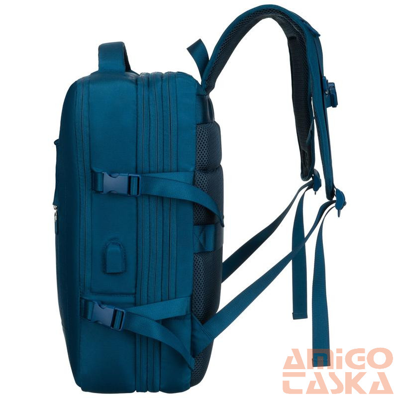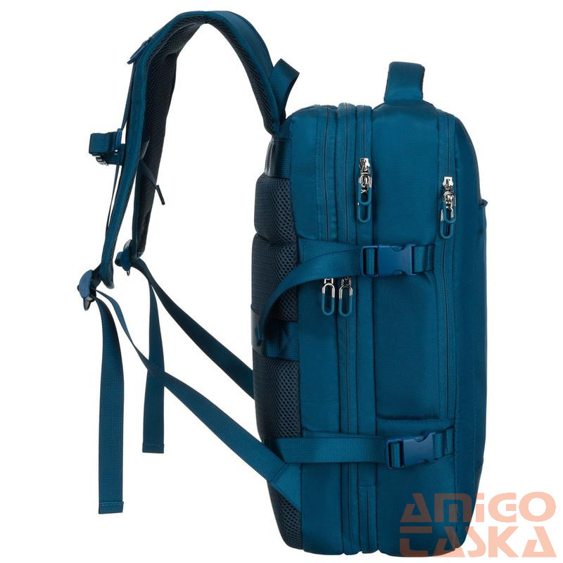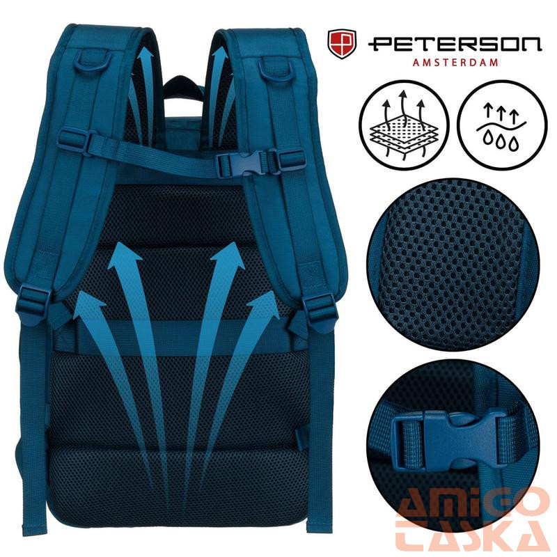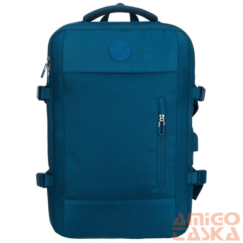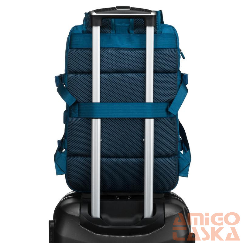 A hátoldalon található széles pánt lehetővé teszi a hátizsák biztonságos rögzítését a kézipoggyász fogantyújához. Ez a megoldás tehermentesíti a vállakat, és megkönnyíti a repülőtereken és vasútállomásokon való tájékozódást.