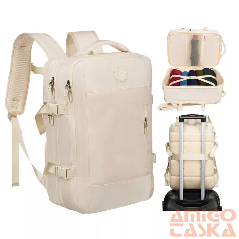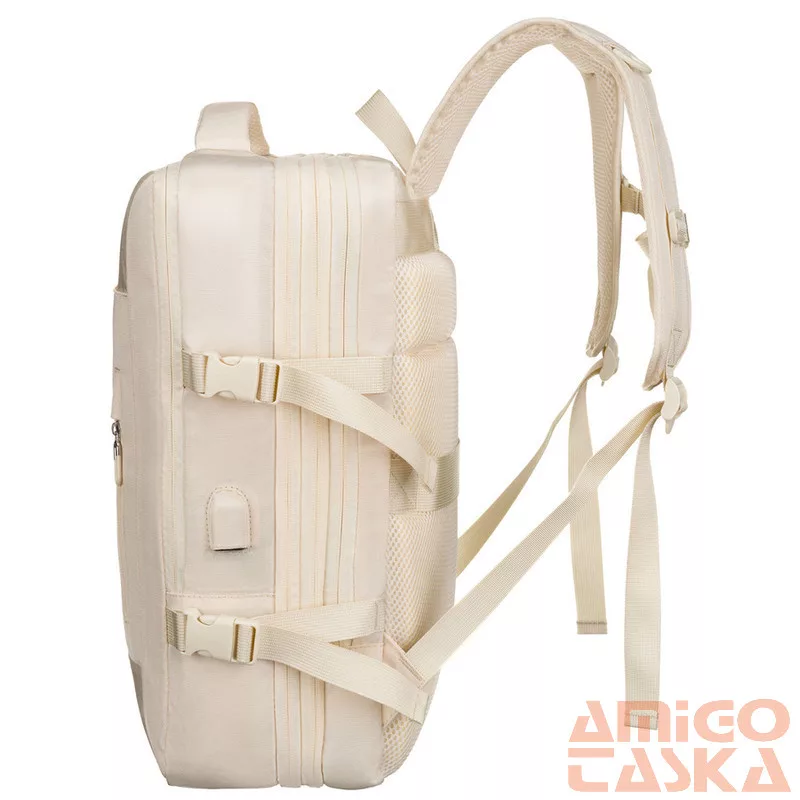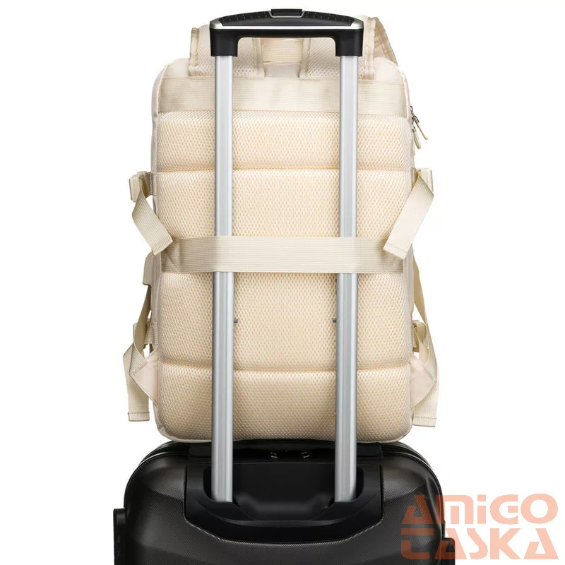 A hátoldalon található széles pánt lehetővé teszi a hátizsák biztonságos rögzítését a kézipoggyász fogantyújához. Ez a megoldás tehermentesíti a vállakat, és megkönnyíti a repülőtereken és vasútállomásokon való tájékozódást.