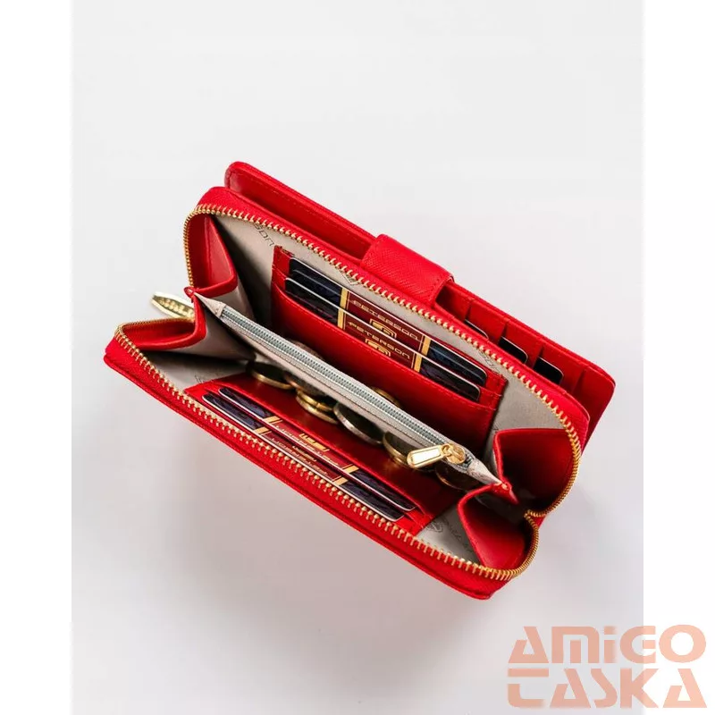 A pénztárca patenttal és cipzárral rögzíthető . Kinyitása után egy tágas részhez jutunk, ahol: