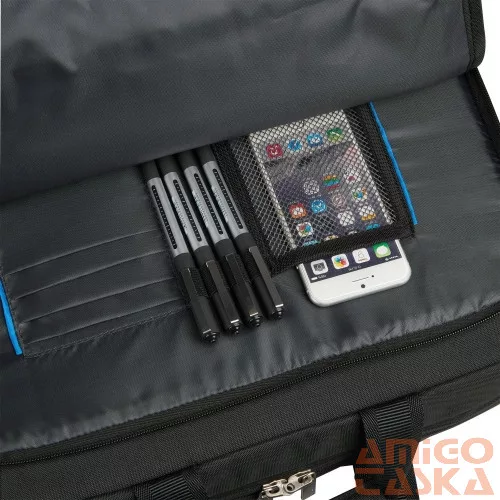 A Roncato Easy Office 2.0 laptoptáska nemcsak elegáns, de rendkívül praktikus is. Kézben, valamint felcsatolható vállszíjával vállon kényelmesen hordható, bőröndök húzószerkezetére ráhúzható. A laptáska egy fő- és két mellékrekesszel rendelkezik. Főrekeszében 15,6"-os laptopunkat tudjuk elhelyezni, illetve egy 10"-os iPadtartó / tablet tartó is helyet kapott. Ugyanitt találunk egy nagyobb méretű nyitott zsebet is. A laptoptáska egyik cipzáras mellékrekeszét mobil-, toll-, és egy négyfakkos névjegytartó gazdagítja, elülső, kisebb mellékrekesze remek hely egyéb apróságaink, személyes tárgyaink tárolására. A termékre a gyártó 3 év garanciát vállal.