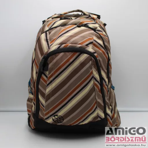 Hátizsák textil vízlepergető anyagból, szivacsos hát és vállkialakítással. Három cipzáros zsebbel, amelyből egyben praktikus rendszerezők találhatóak (kulcstartó, telefontartó, tolltartó, kisebb nagyobb fakkok).Egyik oldalán cipzáros,másik oldalán hálós italtartós zsebbel.