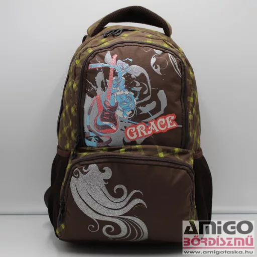Hátizsák, textil vízlepergető anyagból,szivacsos hát és vállkialakítással.Egy nagy és kettő kisebb cipzáras zsebbel. Mindkét oldalán hálós italtartóval.