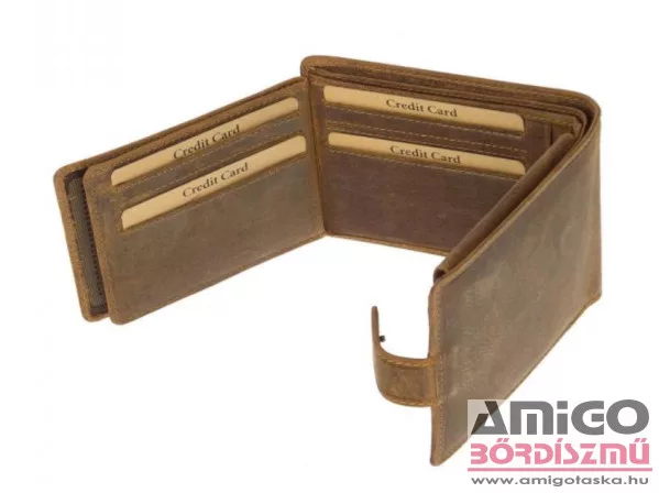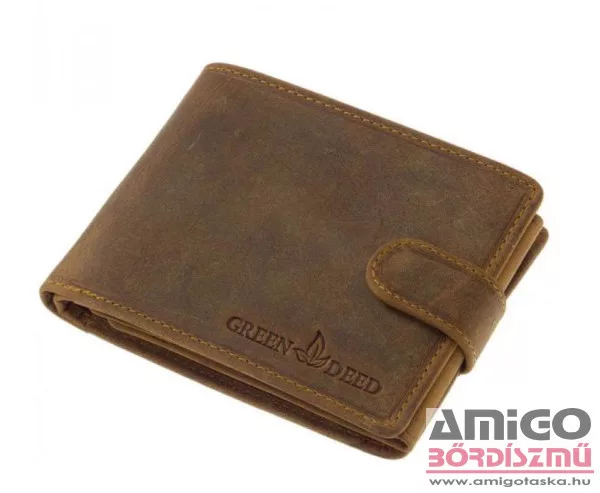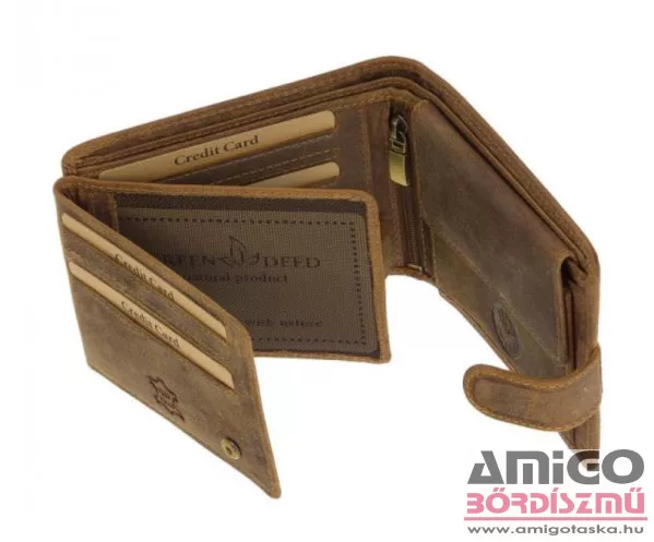 Green deed valódi bőrből készült férfi pénztárca. Praktikus külső átkapcsolóval készült, melyben biztonságban tudhatjuk értékeinket. Kinyitva jobb oldalon aprópénztartó helyezkedik el. Középen cipzáras zsebet találunk, ahol mindkét irányba hasznosítható rekesz húzódik meg. Bal oldalon rengeteg kártya, irattartó, igazolvány és bérlet tárolására alkalmas helyet találunk, mely oldalra kilapozható változatban készült és egy patentos bőrpánttal le is zárható. Dupla rekeszes bankjegytartóval rendelkezik.