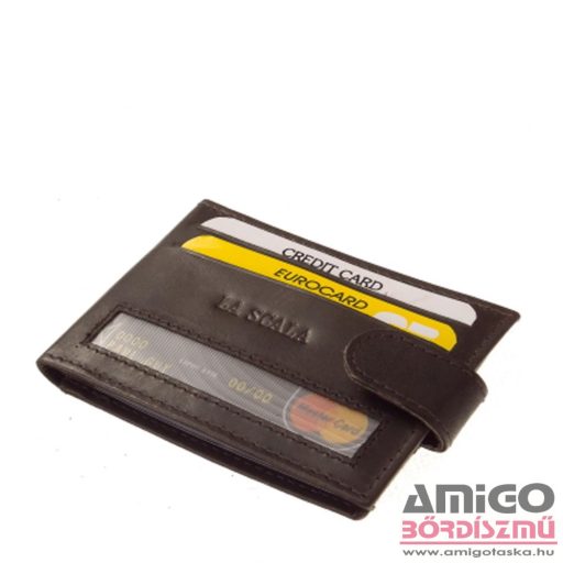 Valódi bőrből készült kártyatartó. Fedele középen egy átkapcsolóval rögzíthető, biztonságossá téve kártyáink tárolását. Kinyitva jobb és bal oldalon átlátszó, középen pedig praktikusan használható puha PU anyagból készült kártyatartók kerültek kialakításra. A középső kártyatartó rész cserélhető. Kívülről az irattartó elejére kettő. hátuljára egy kártyát tehetünk még, hátsó rekesze átlátszó.