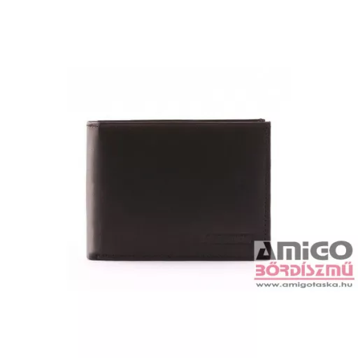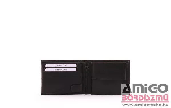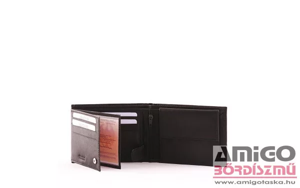 S . belmonte bőrből készült férfi pénztárca. Kinyitva jobb oldalon aprópénztartó helyezkedik el. Középen cipzáras zsebet találunk, ahol mindkét irányba hasznosítható rekesz húzódik meg. Bal oldalon rengeteg kártya, irattartó, igazolvány és bérlet tárolására alkalmas helyet találunk, mely oldalra kilapozható változatban készült és egy patentos bőrpánttal le is zárható. Dupla rekeszes bankjegytartóval rendelkezik.