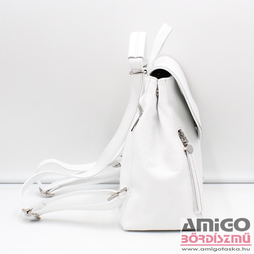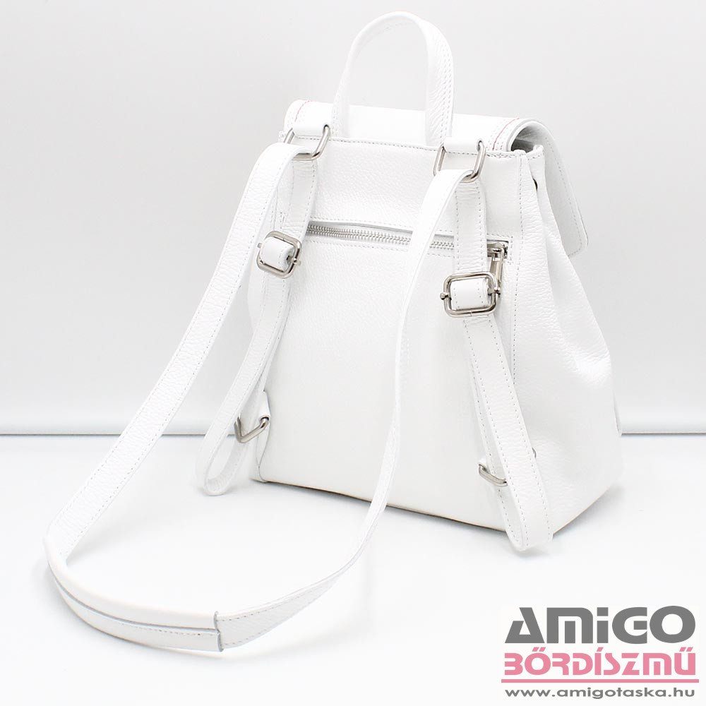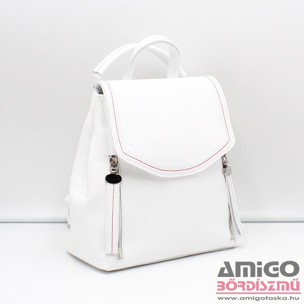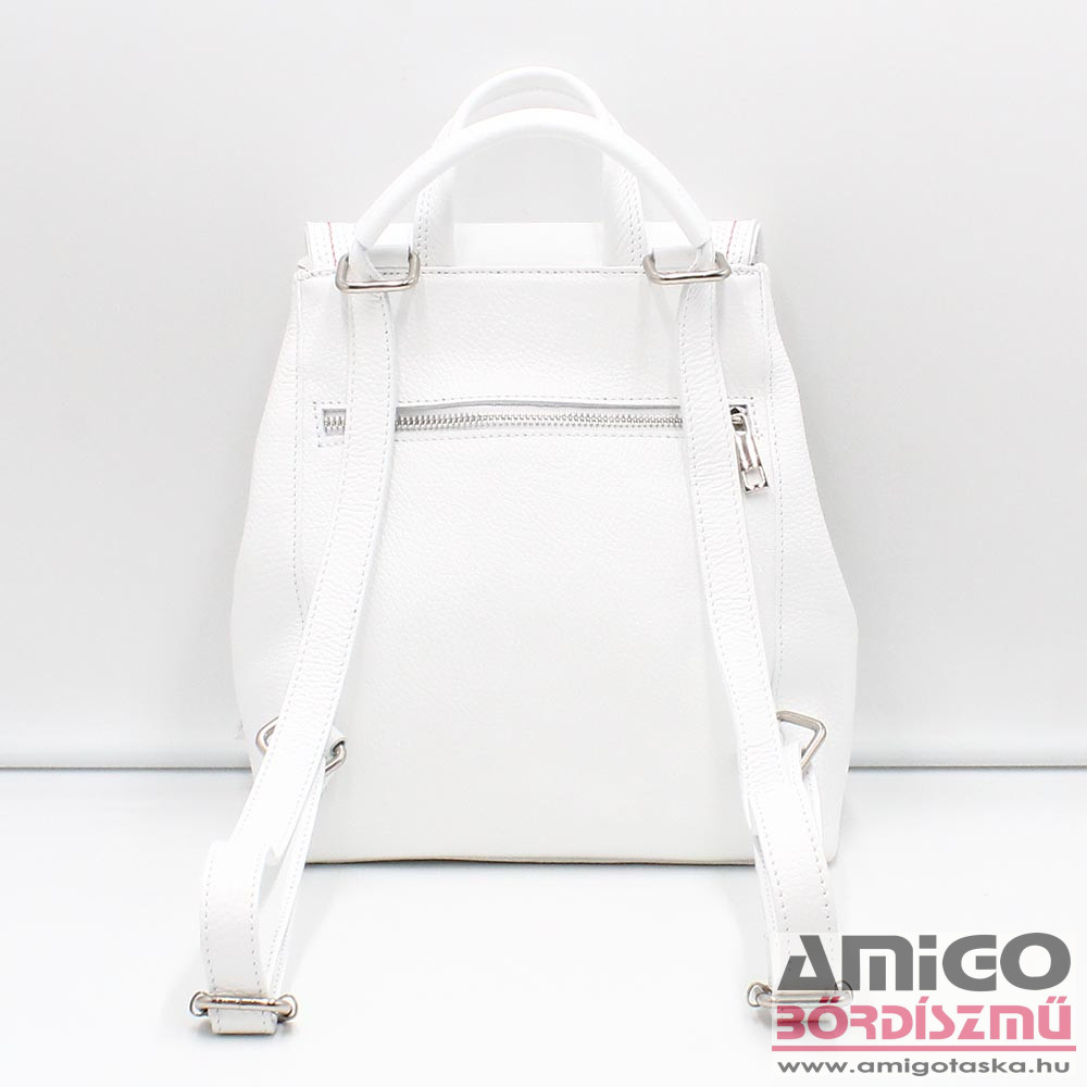 Valódi bőrből készült női hátitáska. A táska mágnespatentos fedele alatt cipzárral nyithatjuk a táskát. Belseje cipzáras fakkal kettéosztott, emellett egy cipzáras bélészsebet is használhatunk. A táska elején kettő, hátulján egy cipzáras zseb lapul még. A hátizsák térfogata növelhető, ha két oldalán szét patentoljuk. A táska vállpántjai állíthatók, illetve pántját felül meghúzva válltáskaként is viselhetjük a terméket.