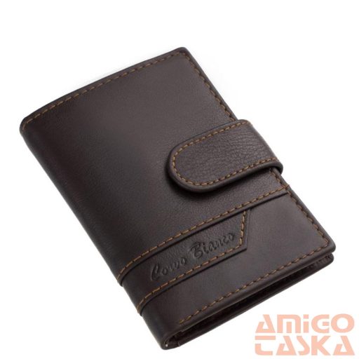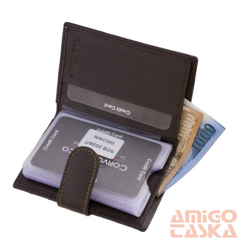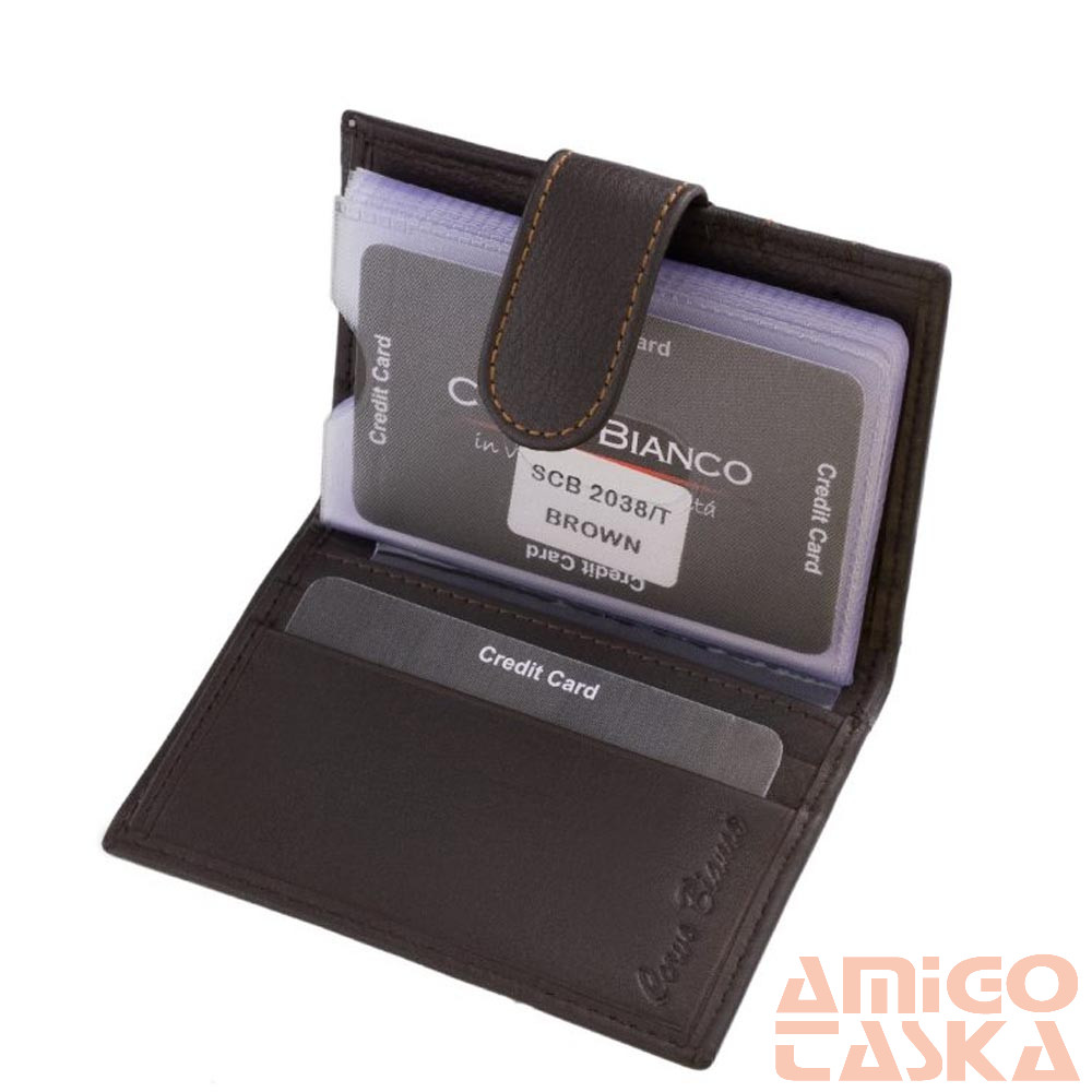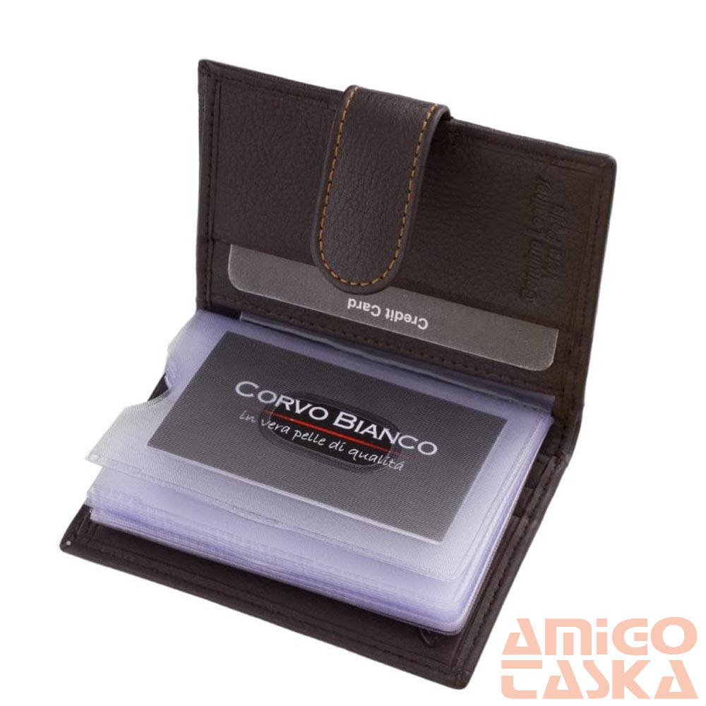 Valódi bőr kártyatartó. Fedele középen egy állítható átkapcsolóval rögzíthető, biztonságossá téve kártyáink tárolását. Kinyitva jobb és bal oldalon bőrből, középen pedig praktikusan használható puha PU anyagból készült kártyatartók kerültek kialakításra. Hátuljában található egy két rekeszes papírpénztartó is a bankjegyek számára.