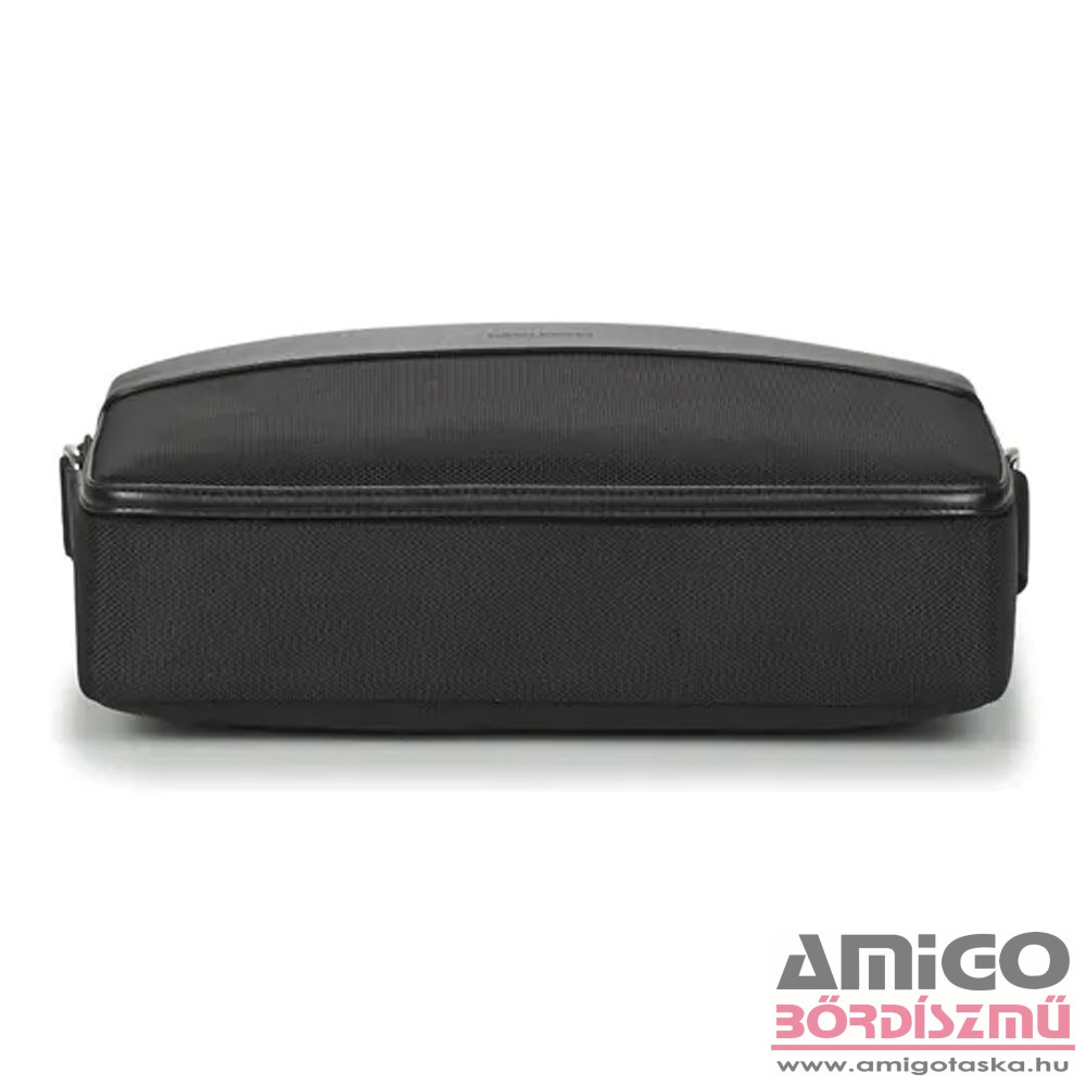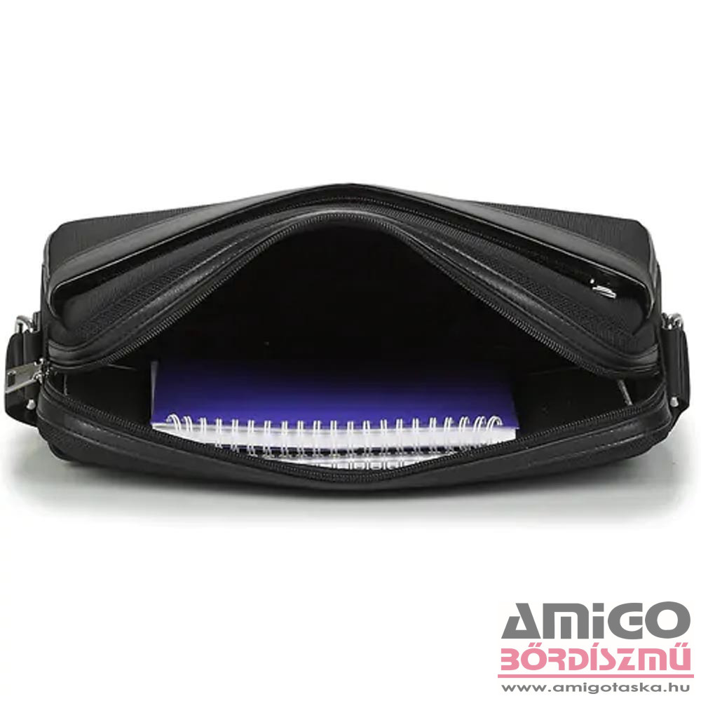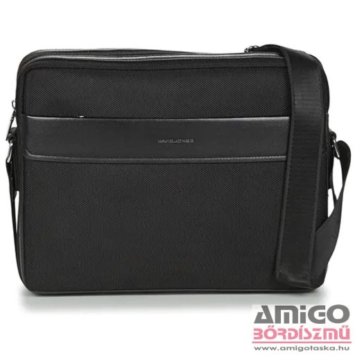 David Jones márkájú, sportosan elegáns fekete műbőr férfi táska. Fekvő elrendezésű, közepesen nagy, A/4-es méret. Letisztult stílusú, feldobják a műbőr részletek. Cipzáras fő rekeszében egy cipzáras bélészseb vele szemben kettő nyitott fakk található. A táska elején egy cipzáras, hátulján egy mágnespatentos zseb rejtőzik. Vállpántja állítható.