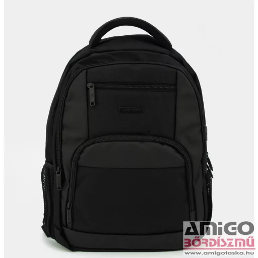David Jones márkájú, 15,6"-os laptoptartós hátizsák. Felül bélelt kézi fogóval rendelkezik, háta párnázott, vállpántja állítható. Hátulján a párnázott rész alatt cipzáras zseb lapul, mely kiváló lehet értékeinknek. A hátulján bőrönd troli húzókarjára húzható pánt található. Hátsó fő része hátfalán tépőzáras gumis pánttal felszerelt bélelt 15,6" laptoptartó áll rendelkezésre. A táska oldalán USB csatlakozó található, ha powerbankon keresztül szeretnénk tölteni eszközeinket. Első főrekeszében kisebb zsebek segítik a rendszerezést. Az elején további két zseb áll rendelkezésre, mindkét oldalán gumis kulacstartó található.