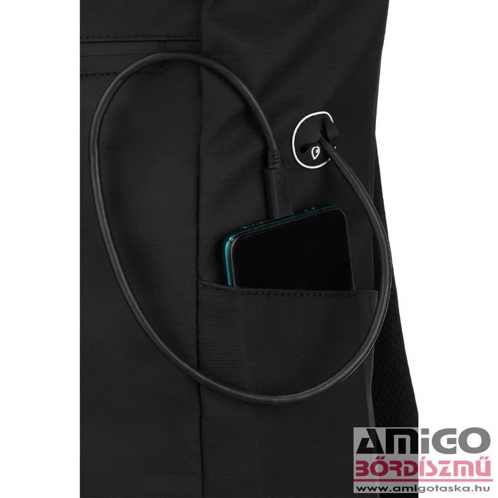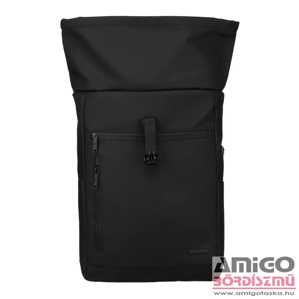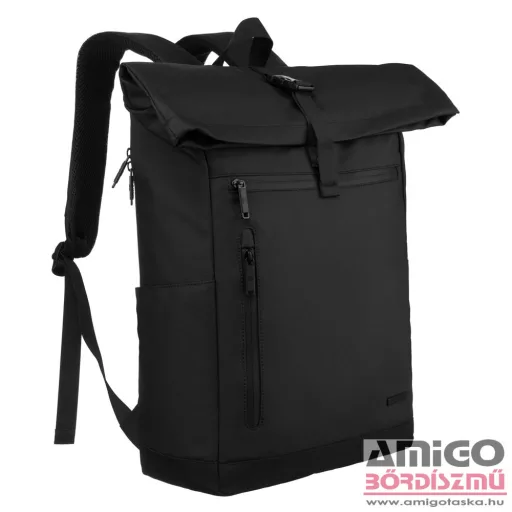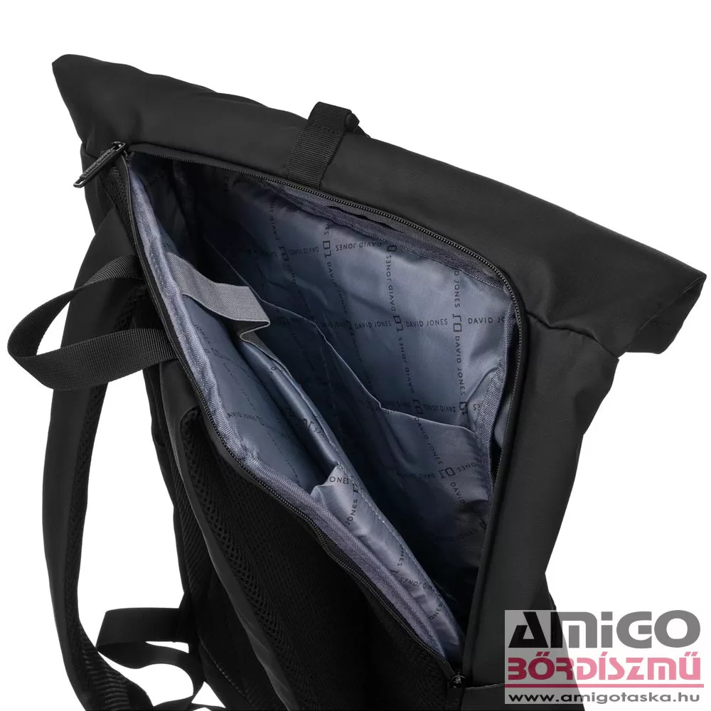 David Jones hátizsák, vízlepergető, erős vászon anyagból, elől kettő lapos, cipzáras zsebbel rendelkezik. Cipzárjai is vízállóak. Biztonságos roll-up tetején csatos záródás is van. Ezen a fő rekeszen kívül hátulján nyitható szivacsos notebook tartót használhatunk. Mindkét oldalán kulacstartó található, kényelmes párnázott hátfallal rendelkezik. Egyik oldalán egy kábel kivezető nyílás van.
