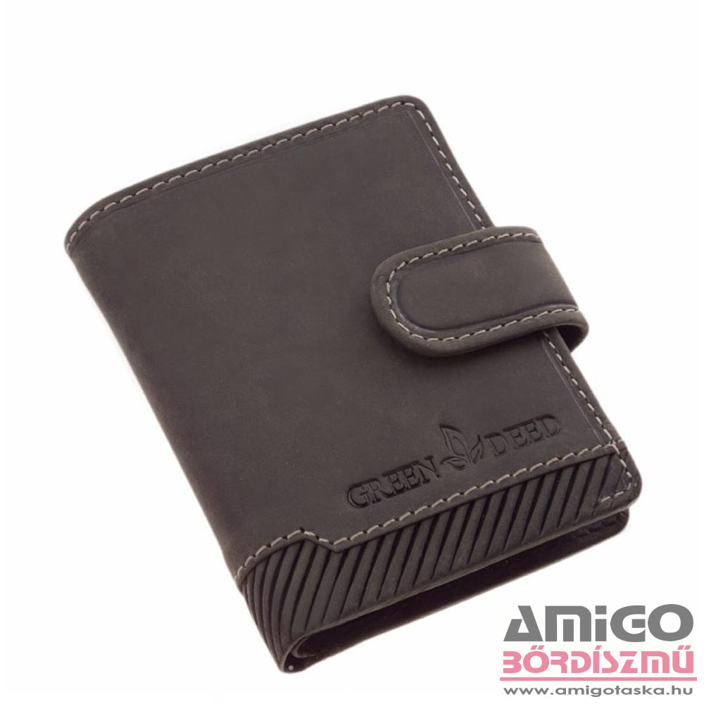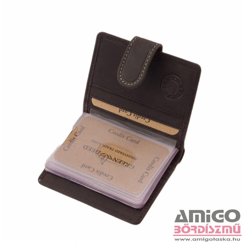 Green deed valódi bőr kártyatartó. Fedele középen egy átkapcsolóval rögzíthető, biztonságossá téve kártyáink tárolását. Kinyitva jobb és bal oldalon bőrből, középen pedig praktikusan használható puha PU anyagból készült kártyatartók kerültek kialakításra. Hátuljában található egy papírpénztartó is a bankjegyek számára.