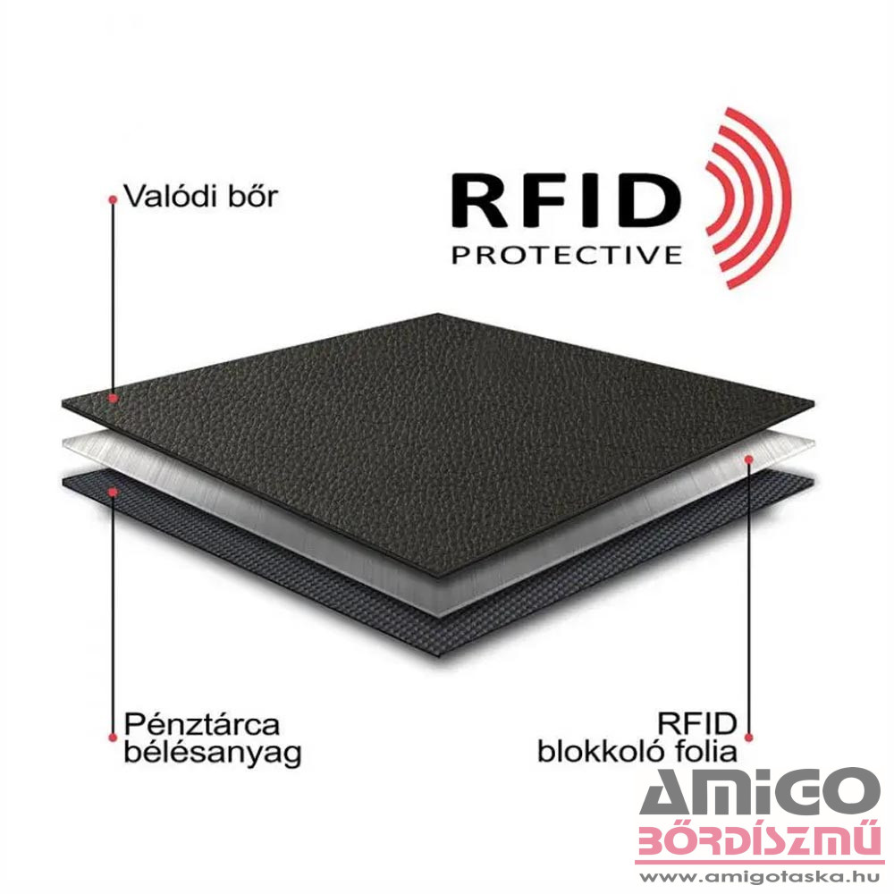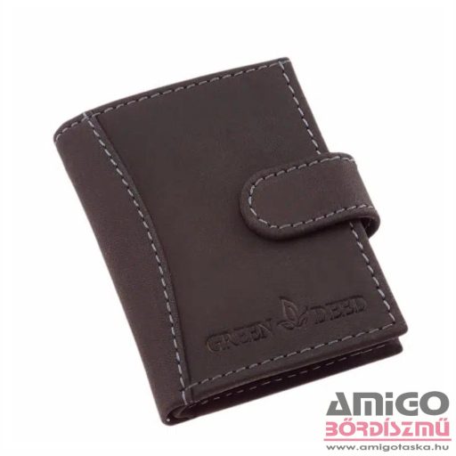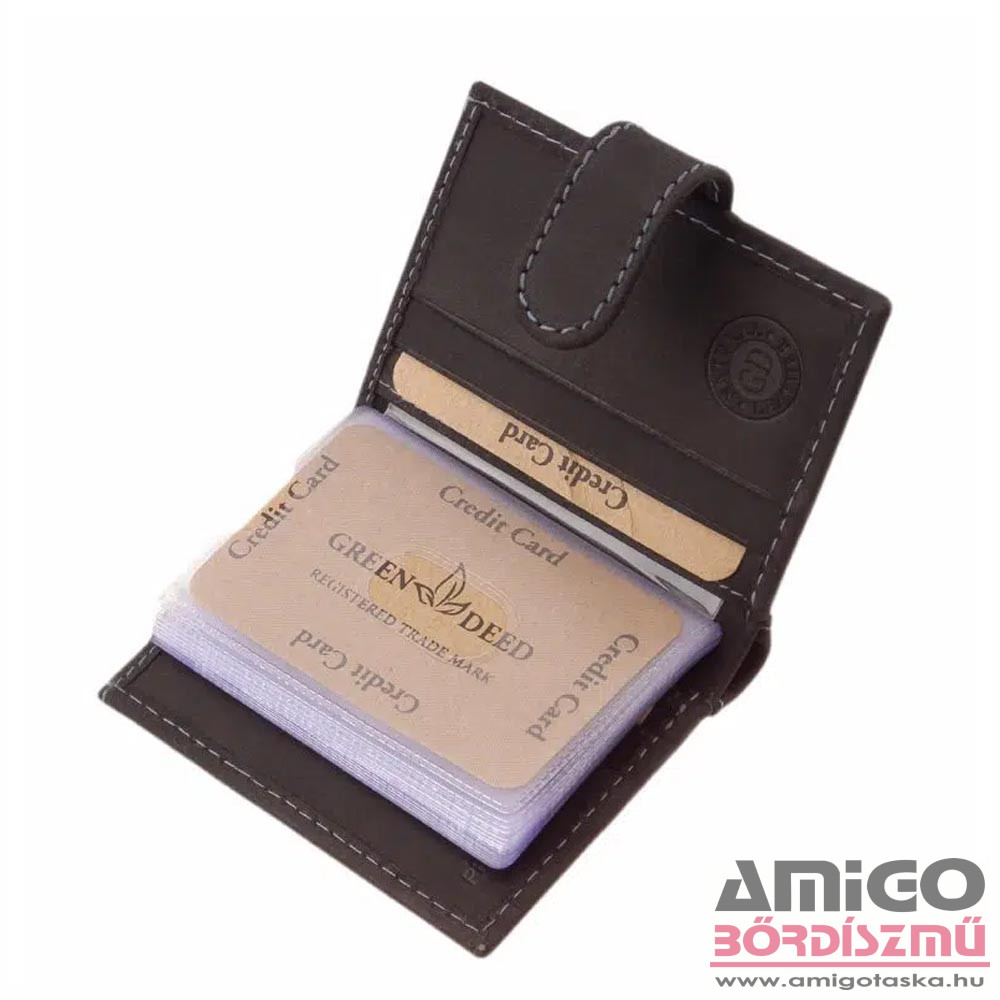 Green deed valódi bőr kártyatartó, a fedelébe beépített RFID fólia révén hatékonyan véd a digitális adatlopás ellen a benne tárolt kártyákra vonatkozóan. Fedele középen egy átkapcsolóval rögzíthető, biztonságossá téve kártyáink tárolását Fedele középen egy átkapcsolóval rögzíthető, biztonságossá téve kártyáink tárolását. Kinyitva jobb és bal oldalon bőrből, középen pedig praktikusan használható puha PU anyagból készült kártyatartók kerültek kialakításra. Hátuljában található egy papírpénztartó is a bankjegyek számára.