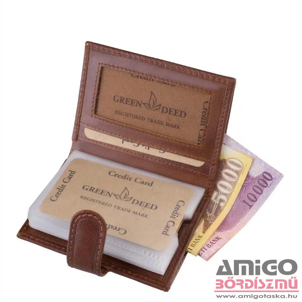 Green deed valódi bőr kártyatartó. Fedele középen egy átkapcsolóval rögzíthető, biztonságossá téve kártyáink tárolását. Kinyitva jobb és bal oldalon bőrből, középen pedig praktikusan használható puha PU anyagból készült kártyatartók kerültek kialakításra. Hátuljában található kettő papírpénztartó is a bankjegyek számára.