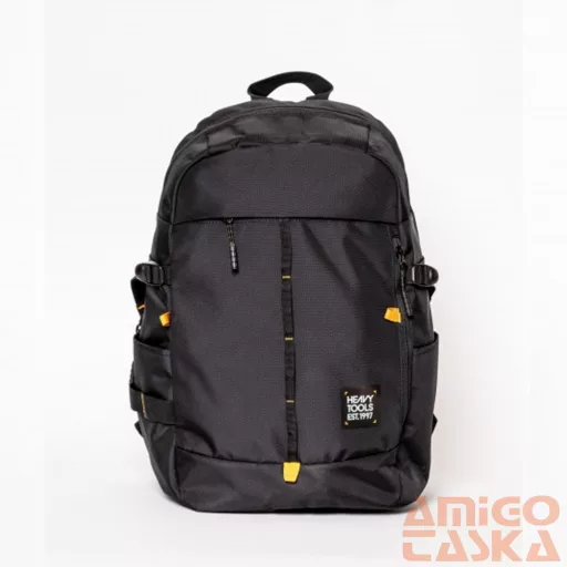 Heavy tools hátizsák, egy rekesszel, oldalán palacktartóval, ergonómikus háttal, állítható és párnázott vállpántokkal, szélesség állító pánttal. Elején cipzáras zseb található, kis márkajelzéssel.