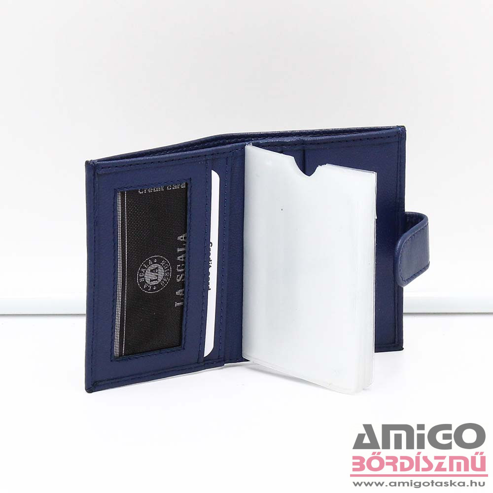 Bőr kártyatartó, melyet kinyitva jobb és bal oldalon bőrből, középen műanyagból készült rekeszek kerültek kialakításra. Fedele középen egy átkapcsolóval rögzíthető, biztonságossá téve kártyáink tárolását. A fedelébe beépített RFID fólia révén hatékonyan véd a digitális adatlopás ellen a benne tárolt kártyákra vonatkozóan. Hátuljában található egy kisebb méretű papírpénztartó is a bankjegyek számára.