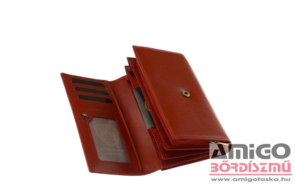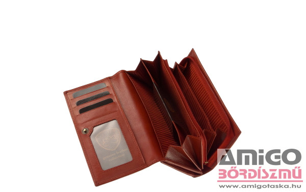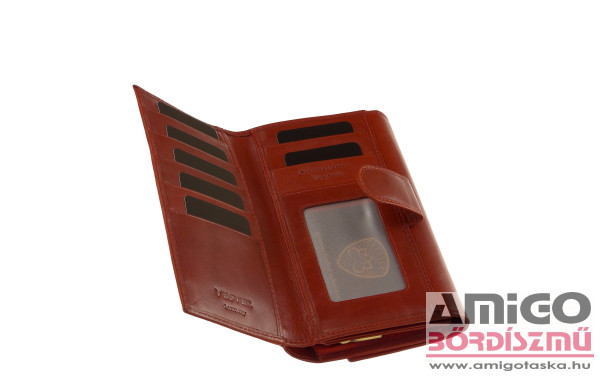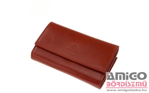 Vester valódi bőrből készült nagy méretű pénztárca. Patentos fedele alatt számos kártyatartó rejtőzik. Belsejében egy cipzáras aprópénztartó és két rekeszes papírpénztartó helyezkedik el. Hátoldala patenttal szintén lekapcsolható, itt található még két hosszanti irányú irattartó és kártyatartók.